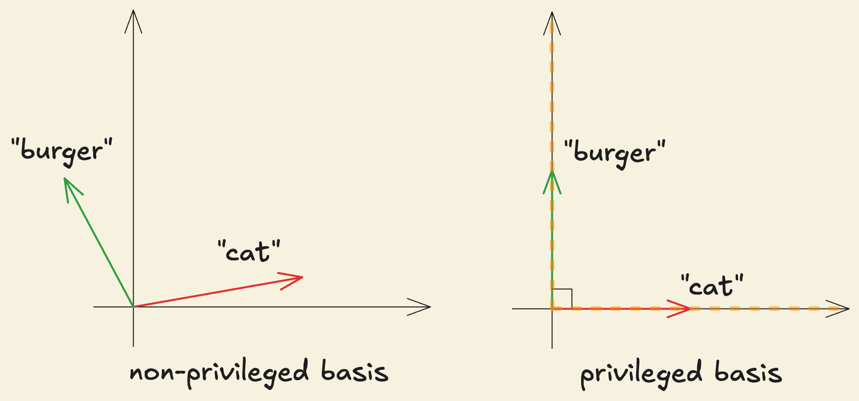 There’s no special relationship between the basis dimension and meaningful concepts. The interpretable concepts are embedded along any arbitrary direction in the vector space, making it non-privileged. In transformers, the residual stream and the attention vectors are non-privileged as well.