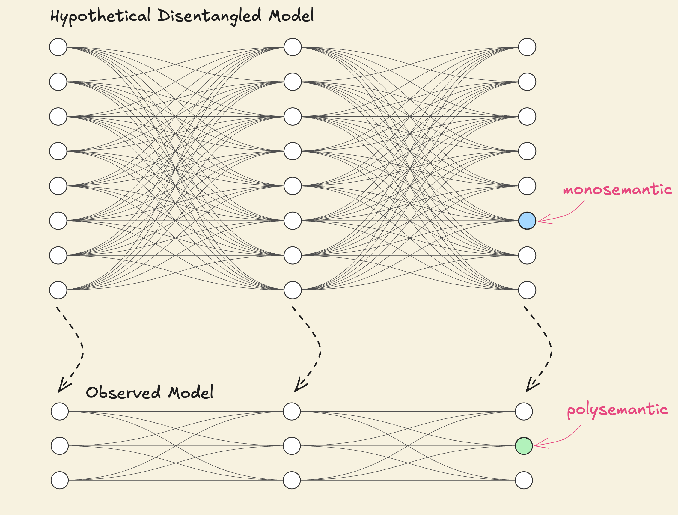 One alternate way to think about the superposition hypothesis is that a neural network is effectively a “compressed, noisy” version of a much larger, idealized network. In this hypothetical larger network, each neuron would correspond to exactly one of the infinite interpretable features with zero interference between features, creating a perfectly disentangled representation where every feature has its own dedicated dimension. However, the actual network we observe is a low-dimensional projection of the larger idealized network where the idealized neurons are projected on to the actual network as “almost orthogonal” vectors which, from the perspective of neurons, presents as polysemanticity.