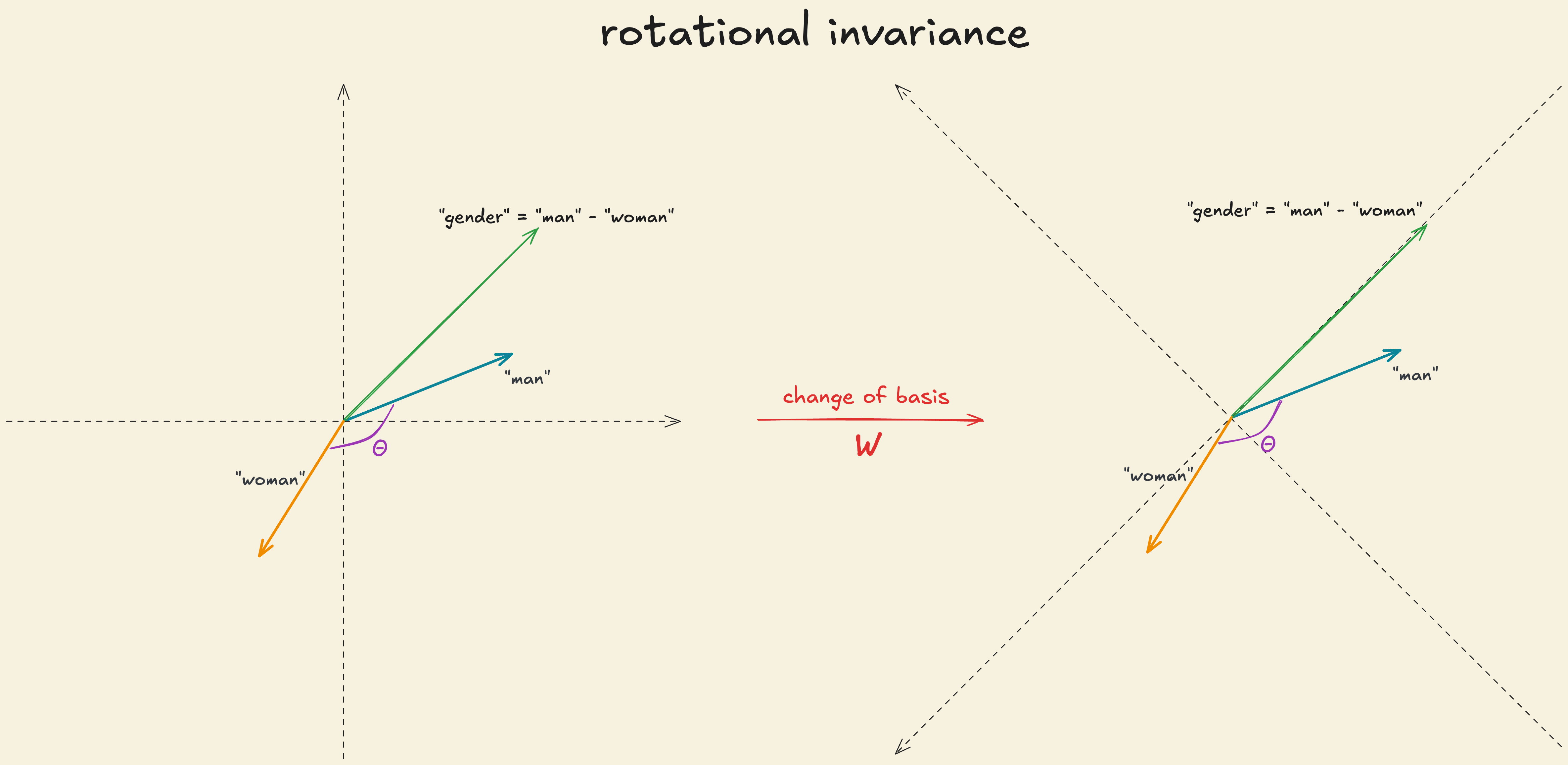 The first transformation that an input to a LLM goes through is the word embedding. The vector space of word embeddings is rotational invariant. What does this mean in practical terms?Suppose is the word embedding of a particular word and let be the weight of the embedding matrix such that the . If you apply a linear transformation to the word embedding and apply to the weight matrix, , it will result in an identical model but where the basis dimensions are totally different. So, and .